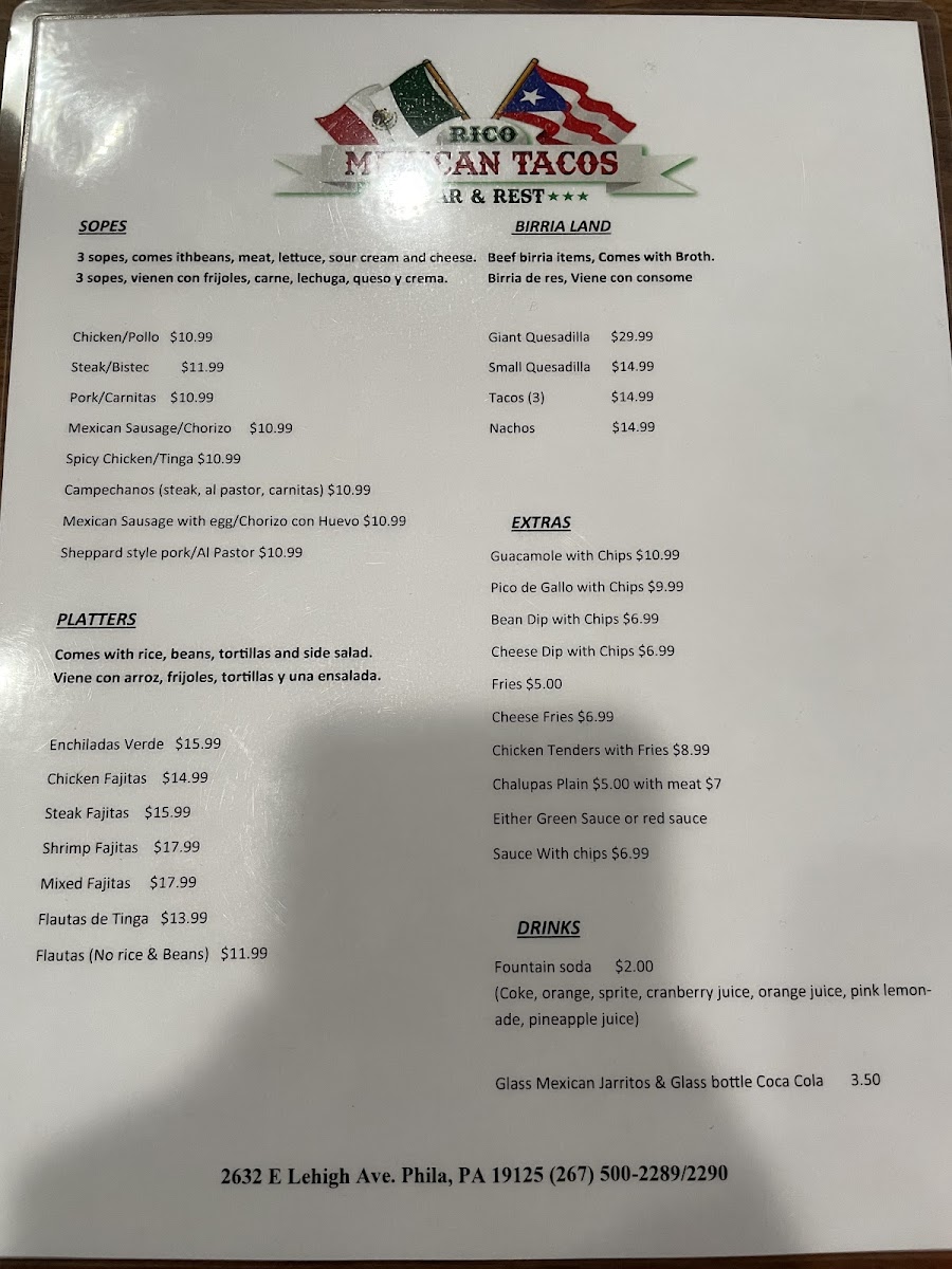 Welcome to Rico Mexican Tacos Bar & Rest, a vibrant dining gem nestled at 2632 E Lehigh Ave, Philadelphia. This delightful eatery specializes in authentic Mexican cuisine, promising a feast that excites the palate. The menu features mouthwatering tacos—crafted from chicken, pork, or spicy chorizo—served in sets of three and garnished with fresh cilantro and onion for just $12.99. Not to be missed are the delectable tostadas and flavorful chimichangas, perfect companions to the festive atmosphere.